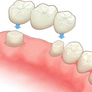 隣の歯を削って橋渡しにして、抜いた部分を補う方法です。橋渡しにして歯を作るので、ブリッジ(橋)と言います。