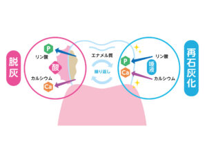 酸にさらされることにより、歯の表面からカルシウムやリンなどが溶け出した状態を「脱灰(だっかい)」と言い、歯の光沢が失われ白く濁ってしまうのです。