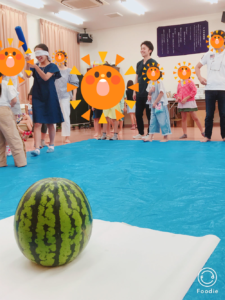 歯科についての紙芝居、歯垢チェックをみんなでして歯磨きの仕方についてみんなで学びました