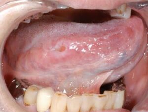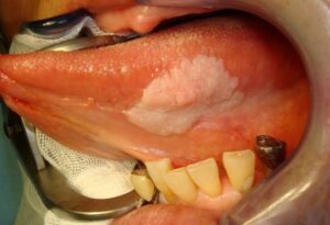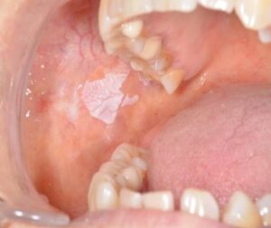 白板症は、白色の板状、斑状の病変で、時にザラザラした感じになることがあります。前癌病変に分類され、1割くらいはガンになると言われています。治療は切除が一般的ですが、病状によっては経過観察になることがあります。白色病変が大きくなったら、濃くなったり、痛む場合は要注意です。
