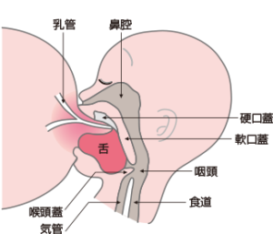 母乳による授乳は後述で詳しく解説しますが、唇と舌で乳首を取り込み、舌で乳首を上あごに押しつけて、下あごを上下に動かすことで母乳を絞り出します。