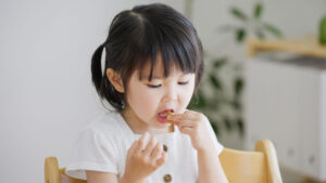 また、乳歯がグラグラしている時期は、硬い食べ物を避けることをおすすめします。硬い食べ物を噛むことにより、乳歯が抜けやすくなり誤飲の可能性が高まるからです。